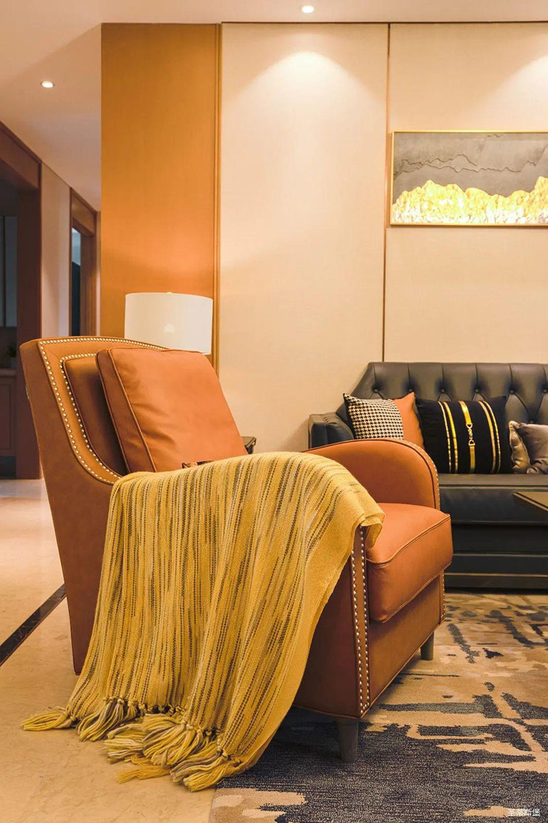 愛馬仕橙的休閑椅是空間的點睛之筆,相對于霸氣沉穩的墨綠雙人沙發,它更為時尚摩登,兩者合理搭配,賦予了空間陽剛與柔情并存的意境。