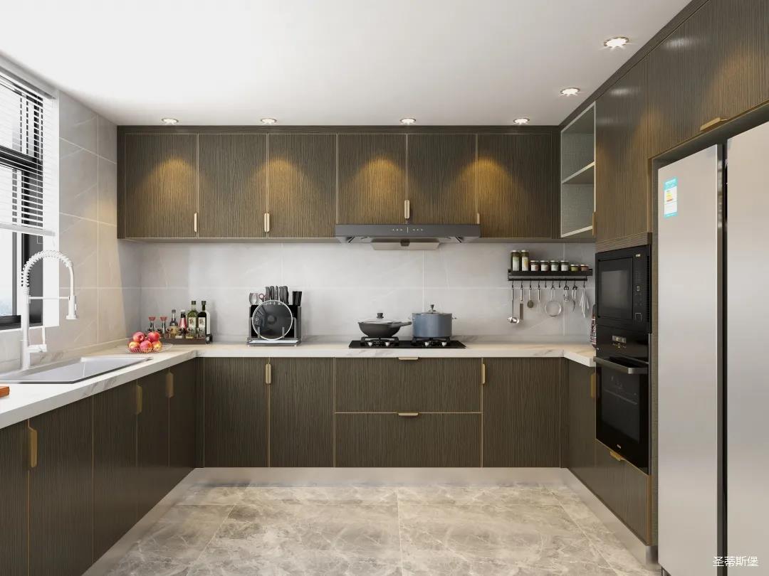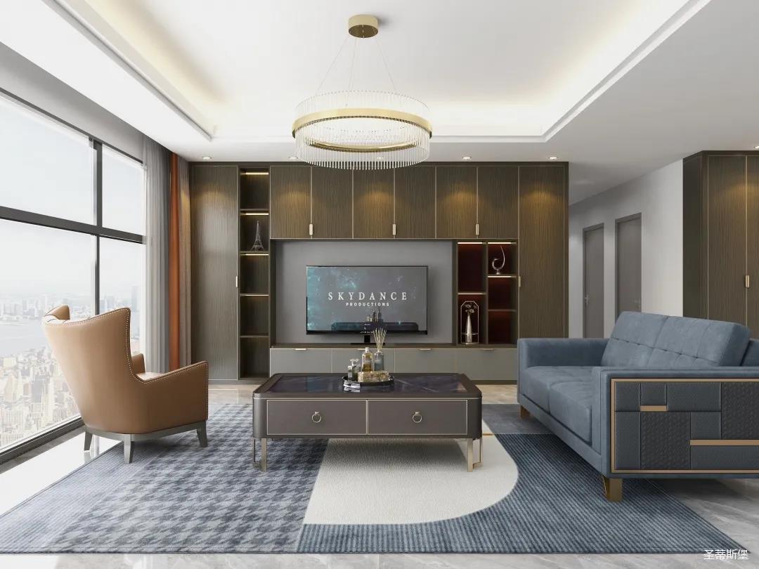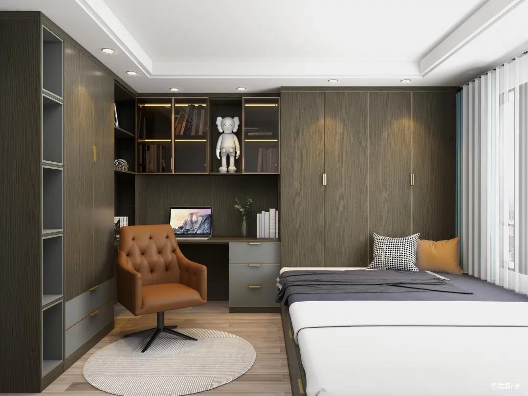 材質的交替與光影的變換,具有濃濃的現代簡奢色彩。獨一無二的英倫爵士灰定制柜,由延邊鑲嵌的香檳金拉絲金屬分割,線條流暢且奢華,不僅代表著時尚,也崇尚了實木韻味。設計師將現代、實用、精致的藝術設計風格應用其中,更是精致生活方式的藝術演繹。在平靜的空間中表現出獨特的藝術骨感,滿足我們對精致生活的精神追求。