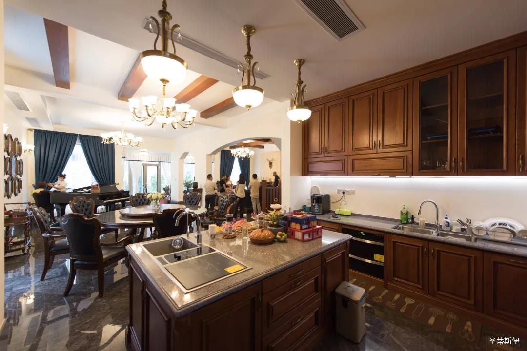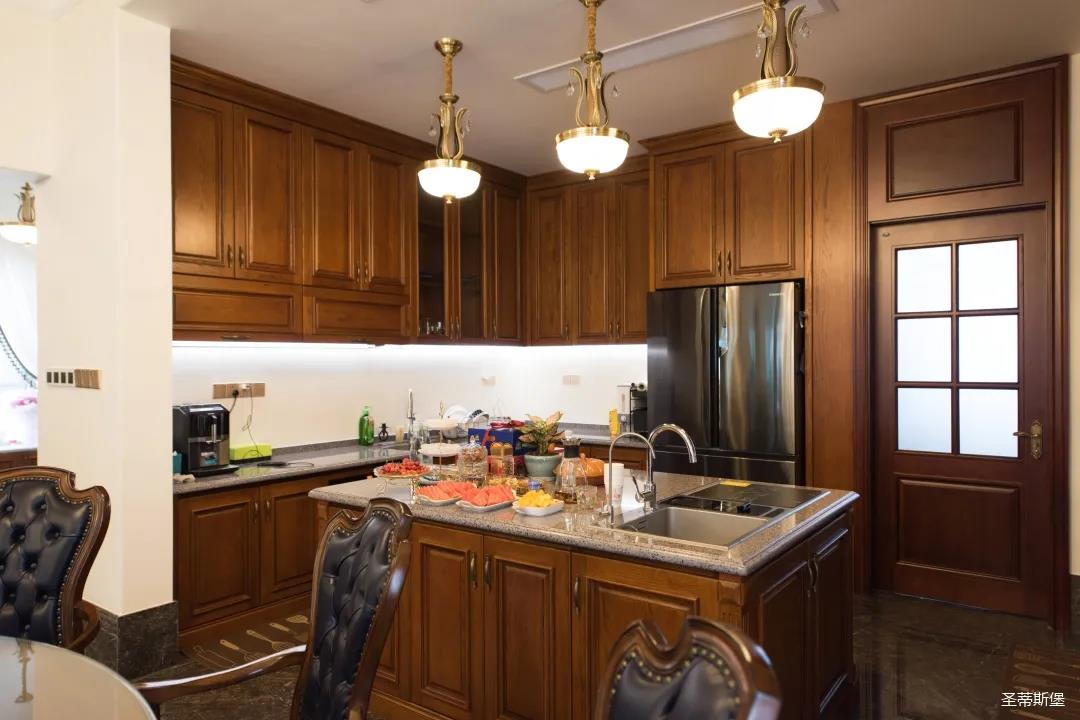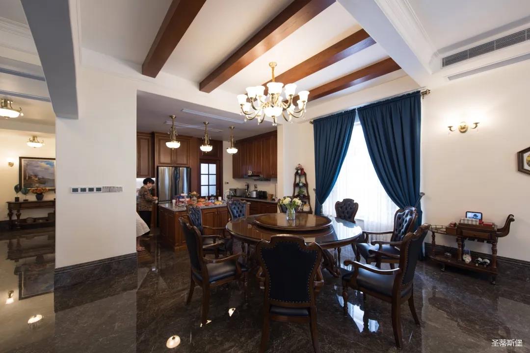 玄關進入轉角處,以穩重大氣實木為主色調的開放式中西餐廚空間,將一體化無隔斷設計貫徹到每個細節,采用了親膚真皮質感的餐椅,手工雕刻的曲線讓原本硬朗的空間變得格外優雅,自上而下,構成完整的美式空間氣度,在每天的生活點滴間,沉浸在美式風情中,更加隨性舒適。