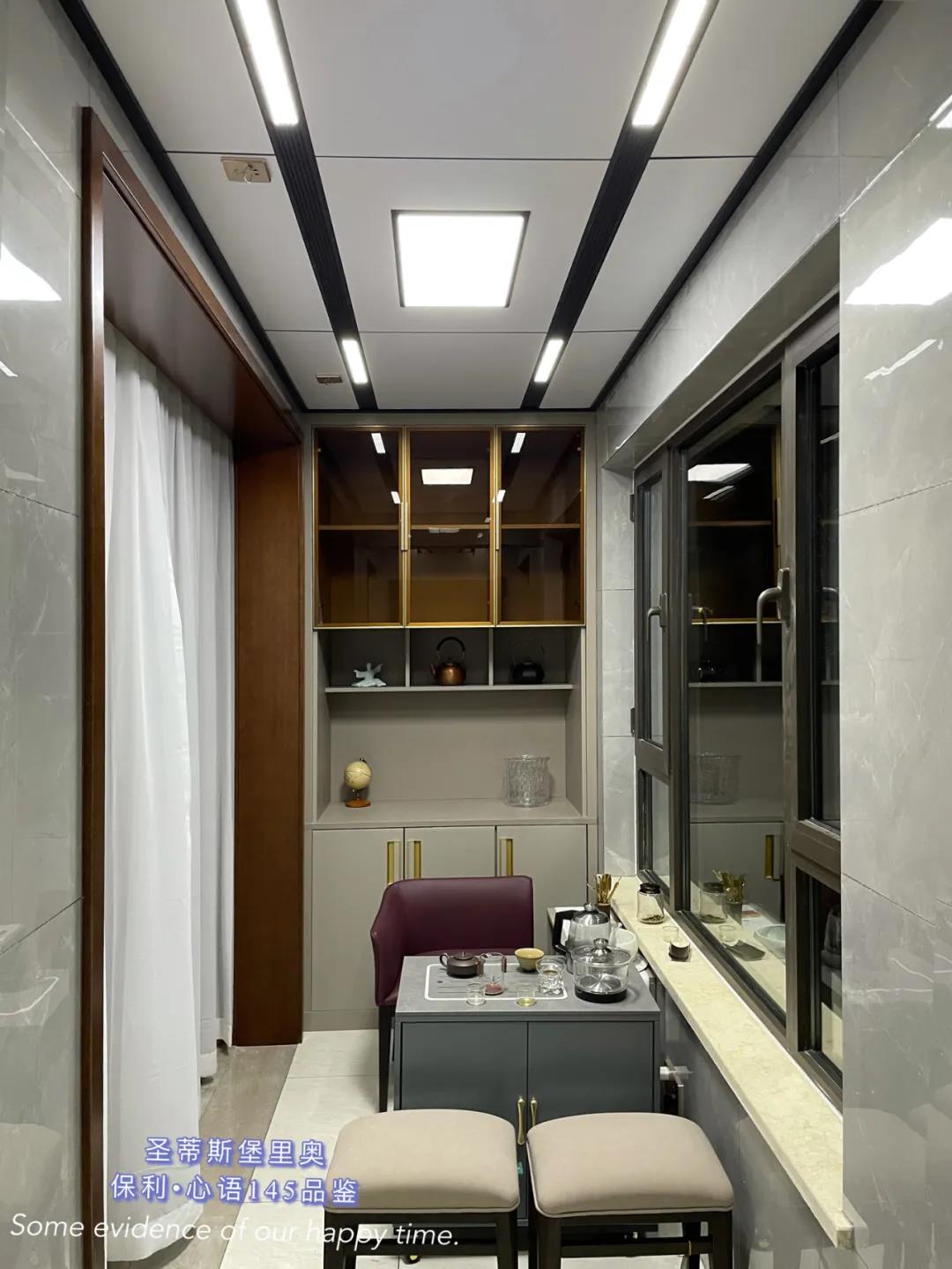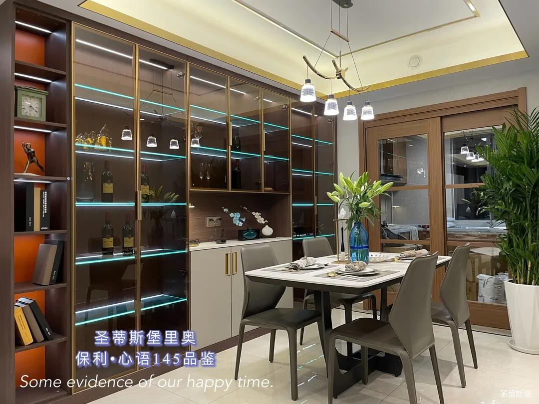 ▲餐廳一面及頂的透明柜體,以簡練的金屬線條分割出收納空間,讓立面視覺更顯精致干凈。餐邊柜設置了臺面、全玻璃展示區(qū)以及隱藏收納區(qū),滿足了日常生活中多樣的收納需求。