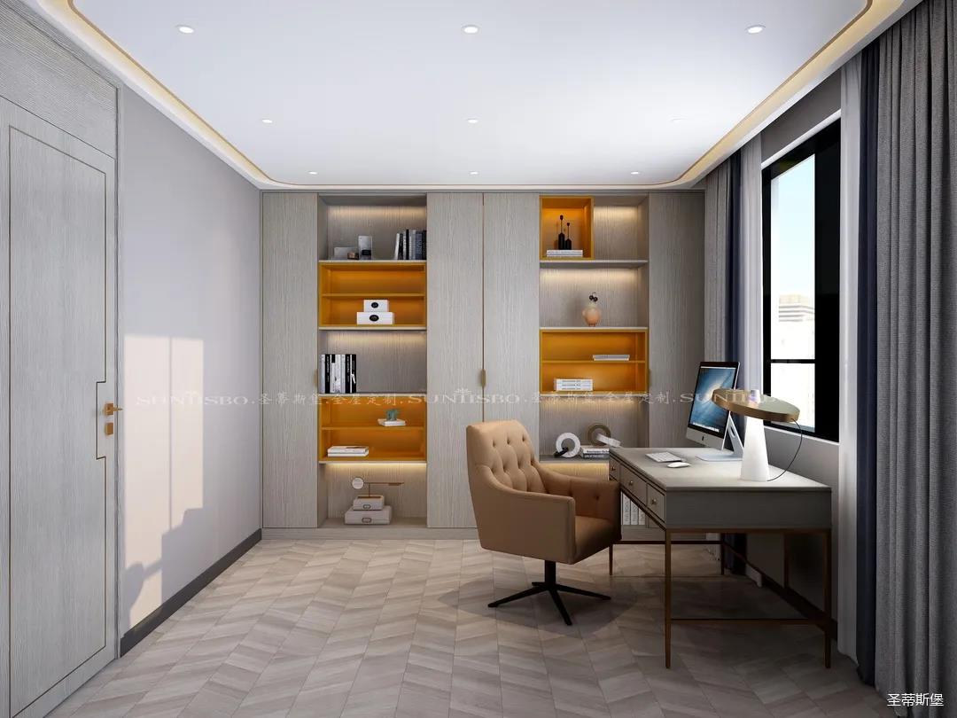英倫仿古灰實木嵌墻書柜,結合同色系的時尚簡約書桌,整個空間都被自然氣息包圍。由于工作原因,加班也成為了生活中的常態,簡約書房設計打破了平時忙碌的生活,也為心中尋得那一方心靜之地。