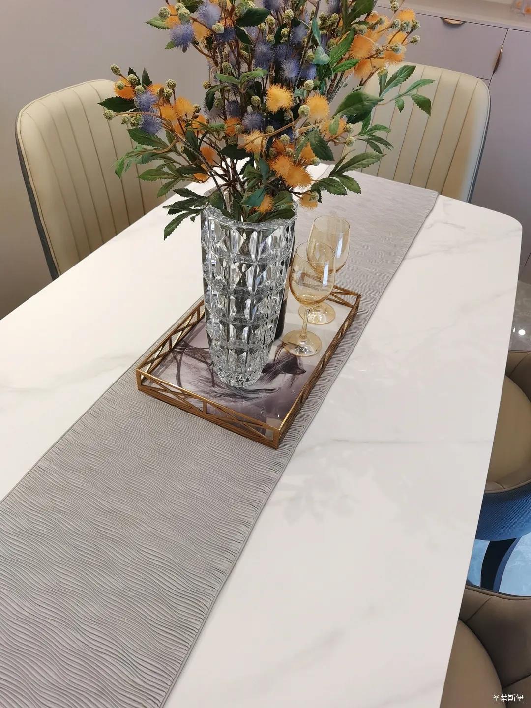 客餐廳雖屬同層,但由廊道隔開,各有寬闊的空間格局,加上引入自然光源的采光設計,空間通透明亮。巖板餐桌搭配的真皮餐椅,讓不同的材質在在空間完美契合,既增加了空間的時尚氛圍,也能給人良好的用餐體驗。