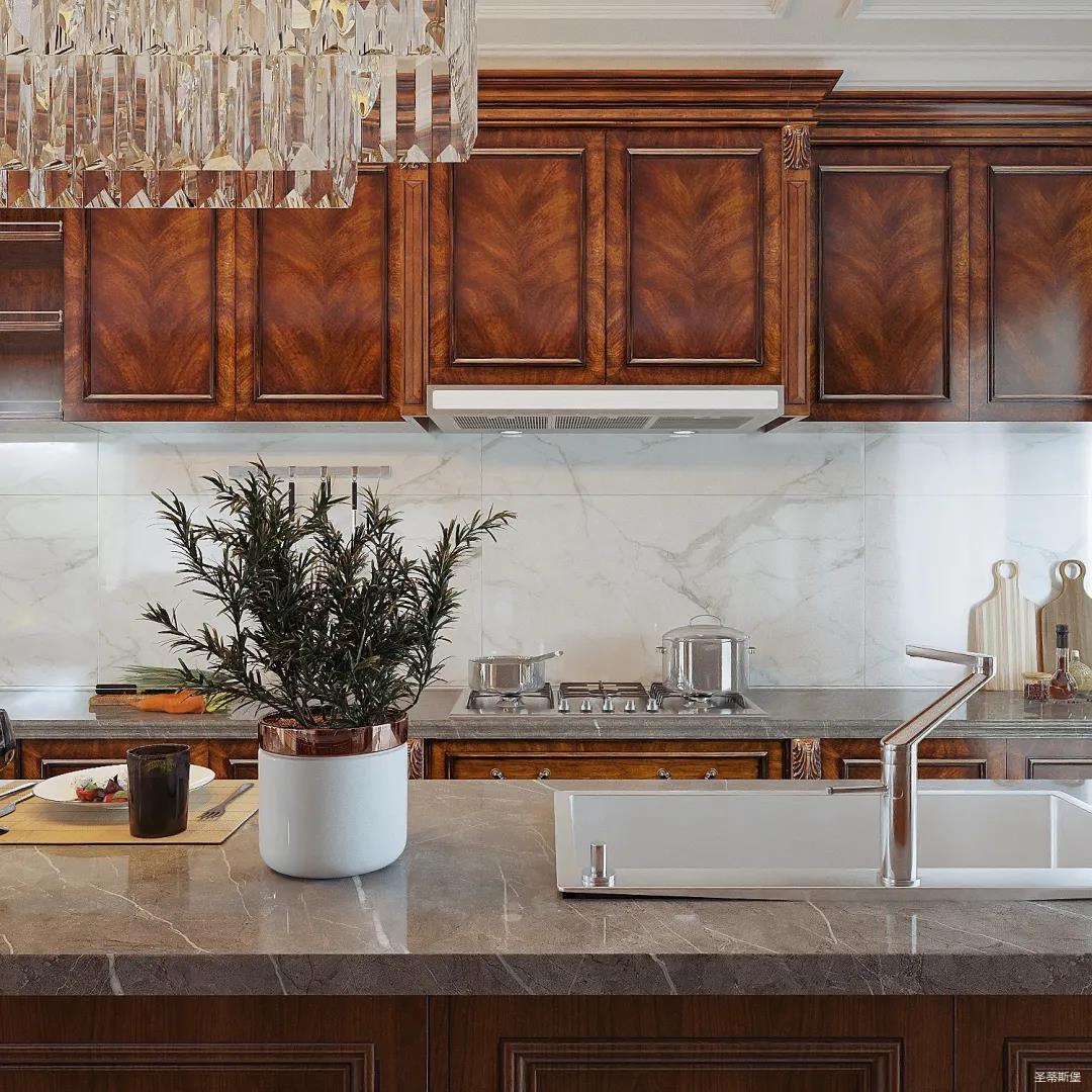 西廚設計更為統一,女業主喜好柔美優雅的視覺效果,因此設計師特意將吊頂轉角做了圓弧處理,使冷峻的空間略帶圓潤,形成精致協調的空間格局。簡潔的石膏吊頂與吧臺一致延伸,讓廚房視覺空間得以擴大。金屬元素水晶吊燈,增加了空間的精致感,美式定制柜體將古典元素與現代電器相糅合,交錯產生一種自然的違和感。