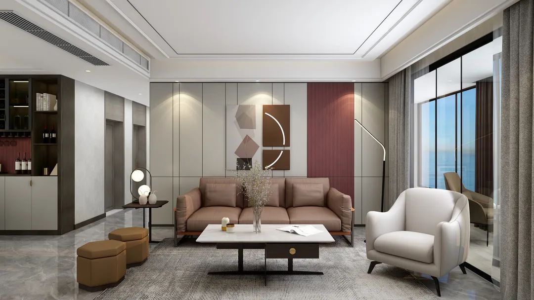 沙發皮色采用深淺不一的咖色拼接。讓空間顯得精致有質感。在沙發的扶手邊框、底座,融入了愛馬仕橙,讓空間多了些靈動的生活氣息。搭配簡約單椅,給人一種視覺上的高級感。