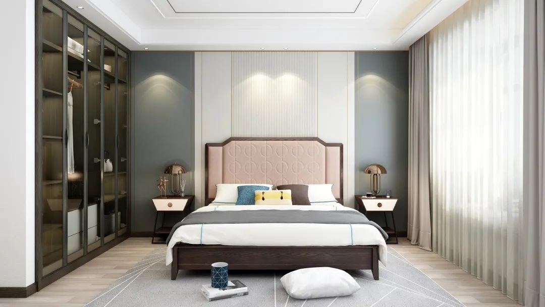 優雅沉靜的霧霾藍床架,干凈利索的線條設計,天然的皮革紋路,與原木色的墻面相呼應,純粹、樸實,營造出輕奢簡約的氛圍,滿足了屋主對空間的無限暢想。