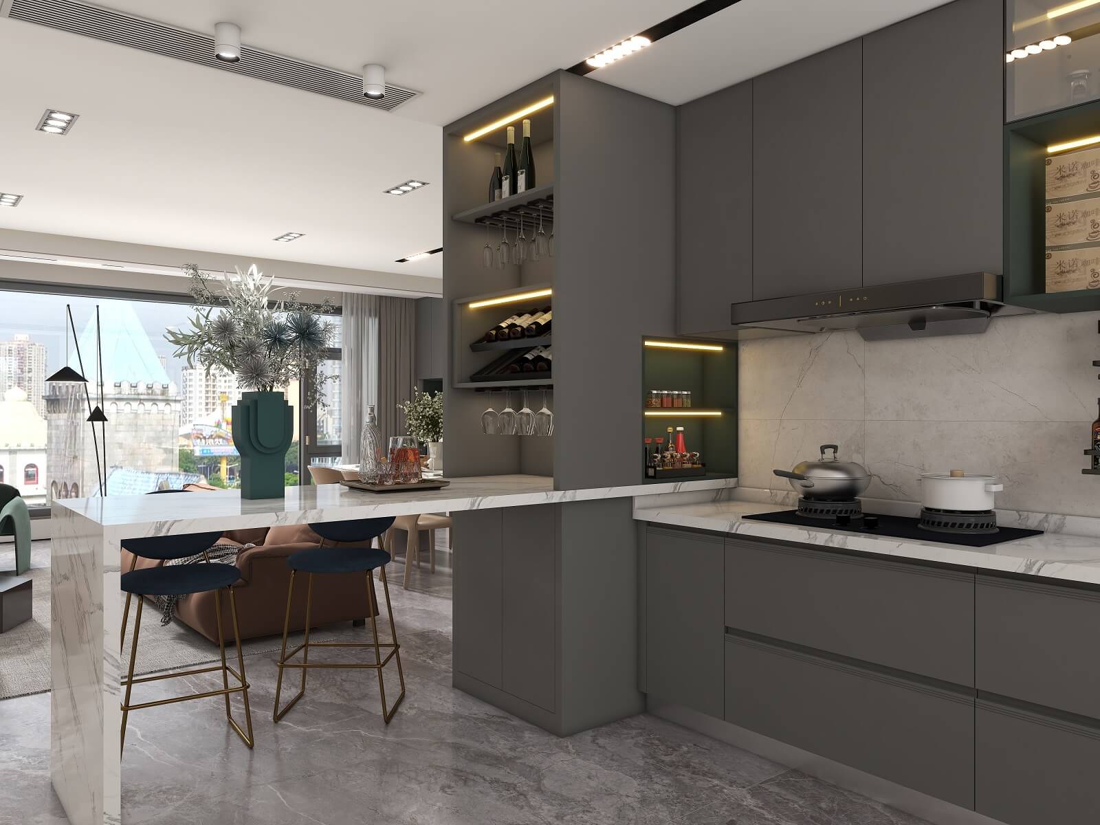 全面開(kāi)放式格局,讓客餐廳之間相互聯(lián)動(dòng),毫無(wú)阻隔,在提升體驗(yàn)感的同時(shí),也增強(qiáng)了整體采光和通風(fēng)。